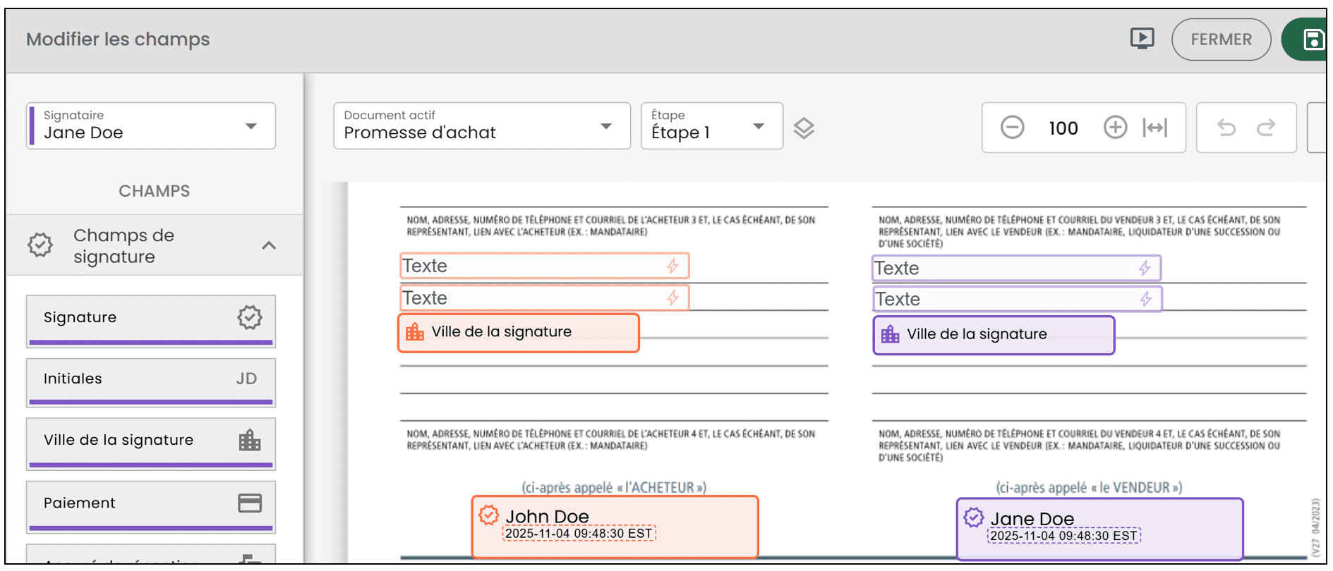 Avant cette amélioration, le processus de complétion et de signature pour plusieurs signataires se déroulait en deux étapes distinctes. Chaque signataire devait d’abord remplir les champs de formulaire, puis attendre que les autres signataires aient aussi complété leurs réponses avant de pouvoir apposer sa signature.