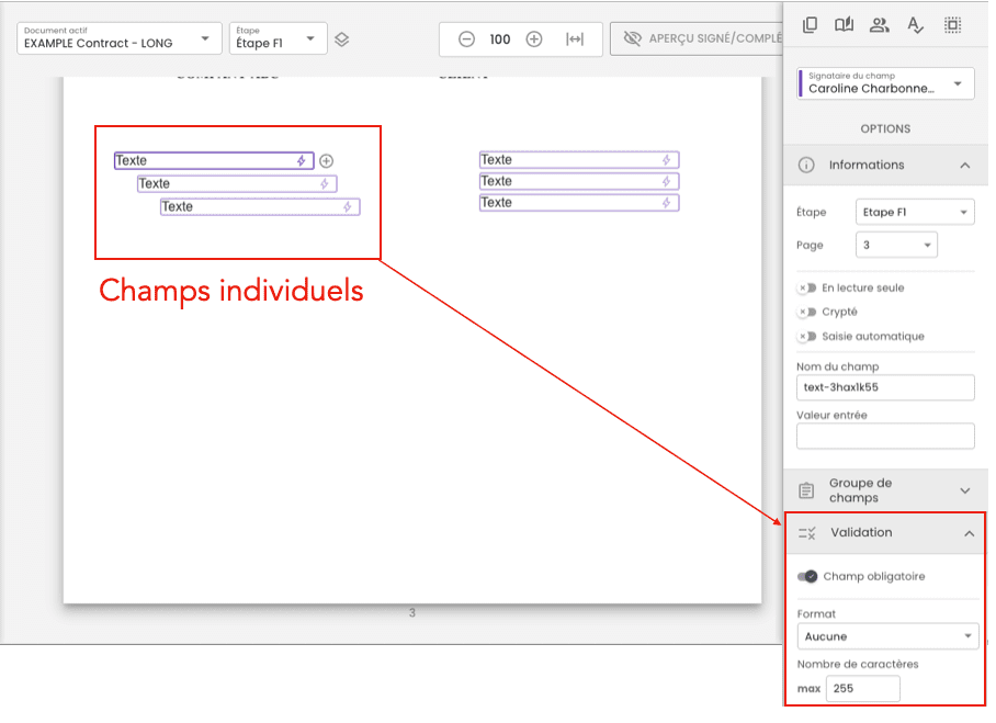 Lorsque vous copiez un champ de formulaire en cliquant sur le « + », celui-ci est désormais automatiquement créé en tant que champ individuel, sans être ajouté à un groupe. Vous avez ainsi la possibilité de configurer la validation pour chaque champ de manière indépendante.
