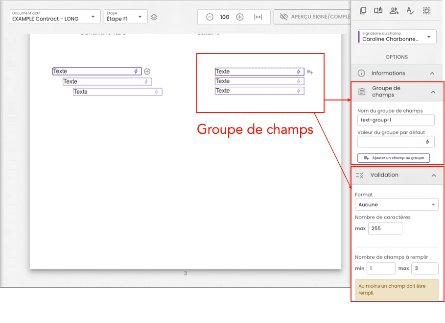 Pour regrouper des champs dans un groupe, il vous suffit désormais de sélectionner le champ, puis de cliquer sur « Ajouter un champ au groupe » dans la section « Groupe de champs ». Les éléments spécifiques au groupe seront désormais regroupés dans cette section, et la validation s’appliquera au groupe dans son ensemble.