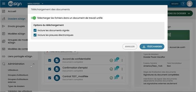 Il est désormais possible de télécharger en un seul fichier PDF tous les documents signés d’un même dossier eZsign. Cette fonctionnalité, offerte à des fins de référence seulement, permet de générer un document de travail unifié, plus pratique à consulter.