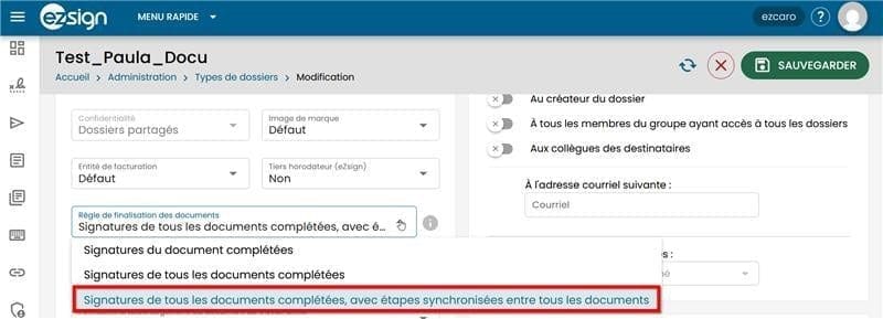 Il est désormais possible de synchroniser les étapes de signature entre plusieurs documents d’un même dossier. Concrètement, cela signifie que l’étape 1 devra être complétée sur tous les documents concernés avant que l’étape 2 ne devienne accessible. Cette amélioration permet une gestion plus fluide des dossiers comportant plusieurs documents, là où auparavant les étapes devaient être franchies document par document.