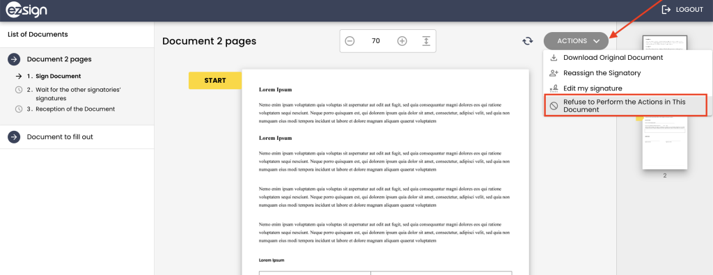 To do so, click the icon “Actions’ in the upper right corner and select the “Refuse to Perform the Actions on This Document” option.
