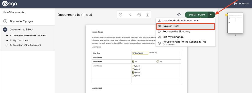 - You can also click on the arrow to the right of the “Submit Form” button and select “Save as Draft”