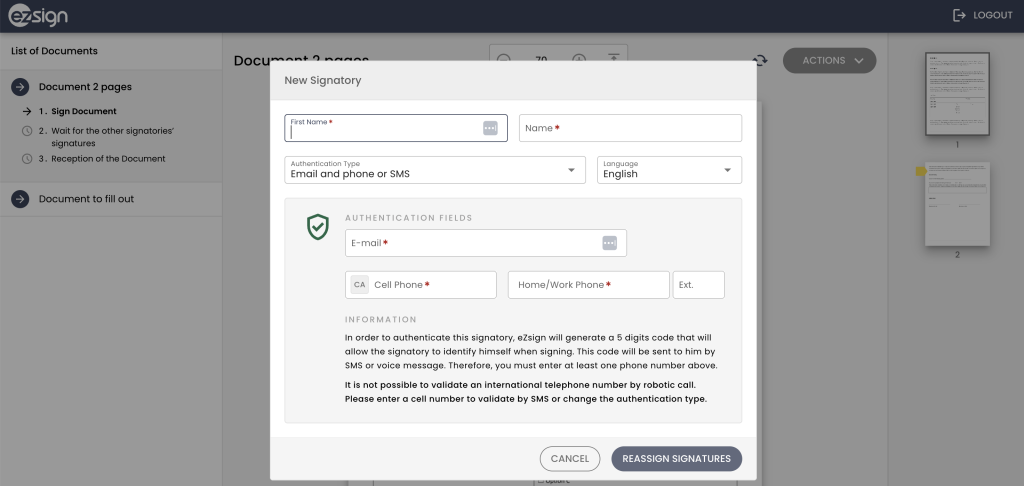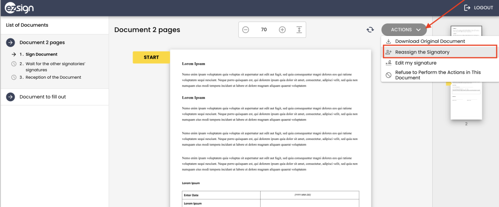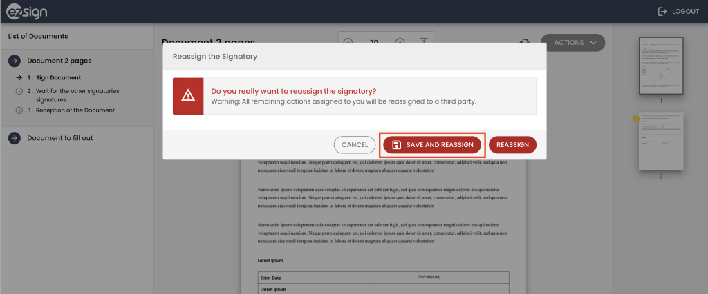 If you have received a document and have actions to complete, you can complete part of it or choose to reassign it entirely to another person. To do so, click the icon “Actions” in the upper right corner and select “Reassign the Signatory.”