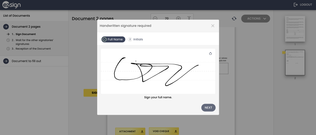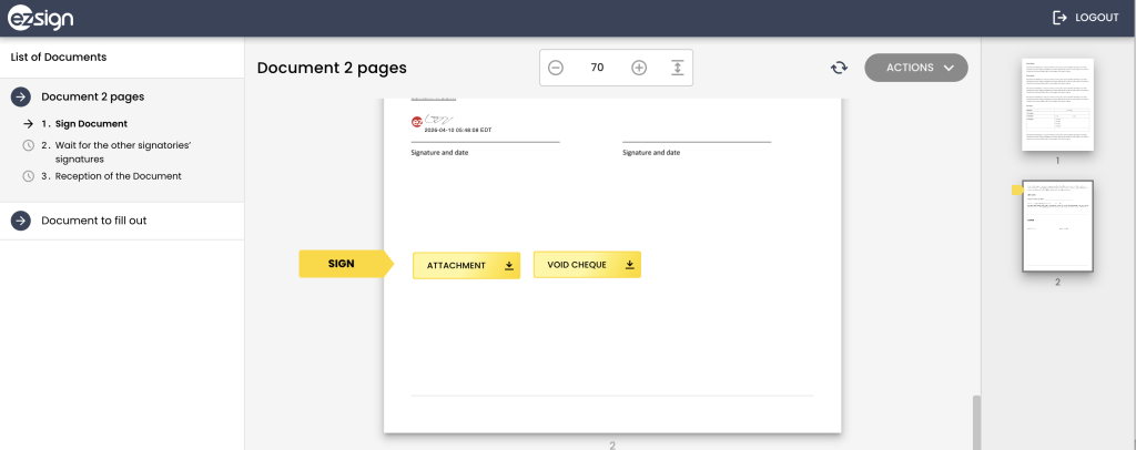 If the document sender asks you to add an attachment, you will see a yellow button labeled “Attachment” (default name) or a more specific name, depending on the sender’s chosen configuration (e.g., ID, void check, etc.).
